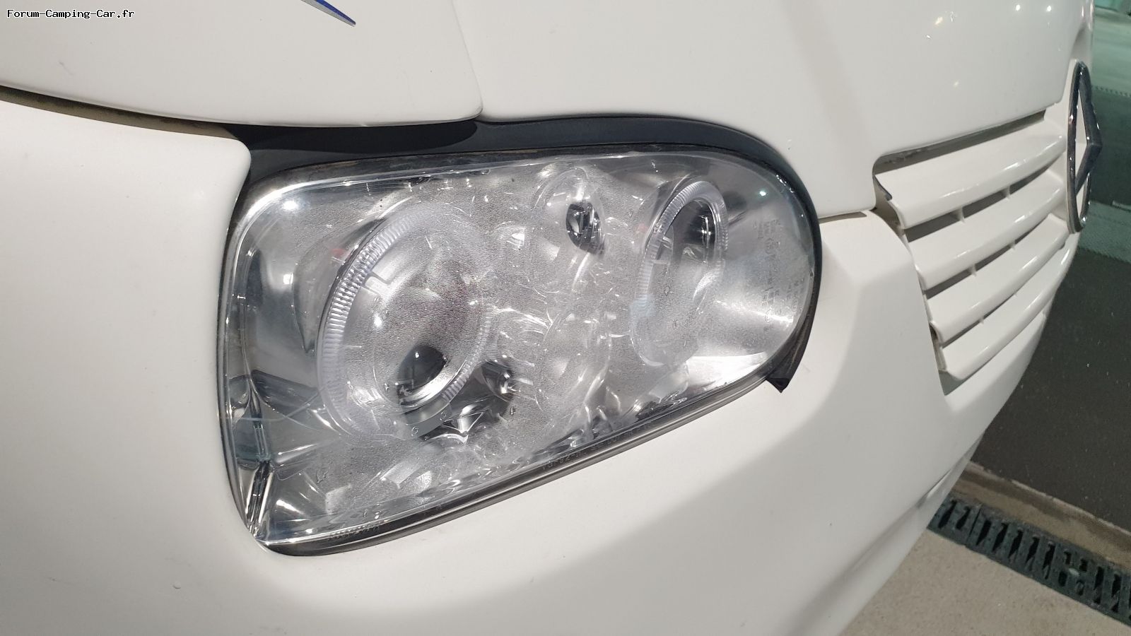 Nous avons eu la surprise de voir le refus du CC au contrôle technique, début mai (ayant anticipé heureusement le rendez-vous bi-annuel) : optique coté droit ayant pris l'humidité, piquée. Le garage Mercedes qui fait l'entretien régulier depuis plus de 10 ans se déclare incompétent, il ne s'agit pas de phares Mercedes !