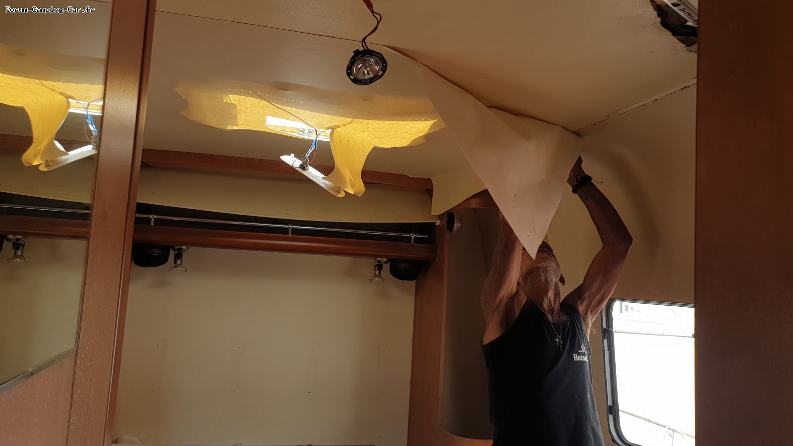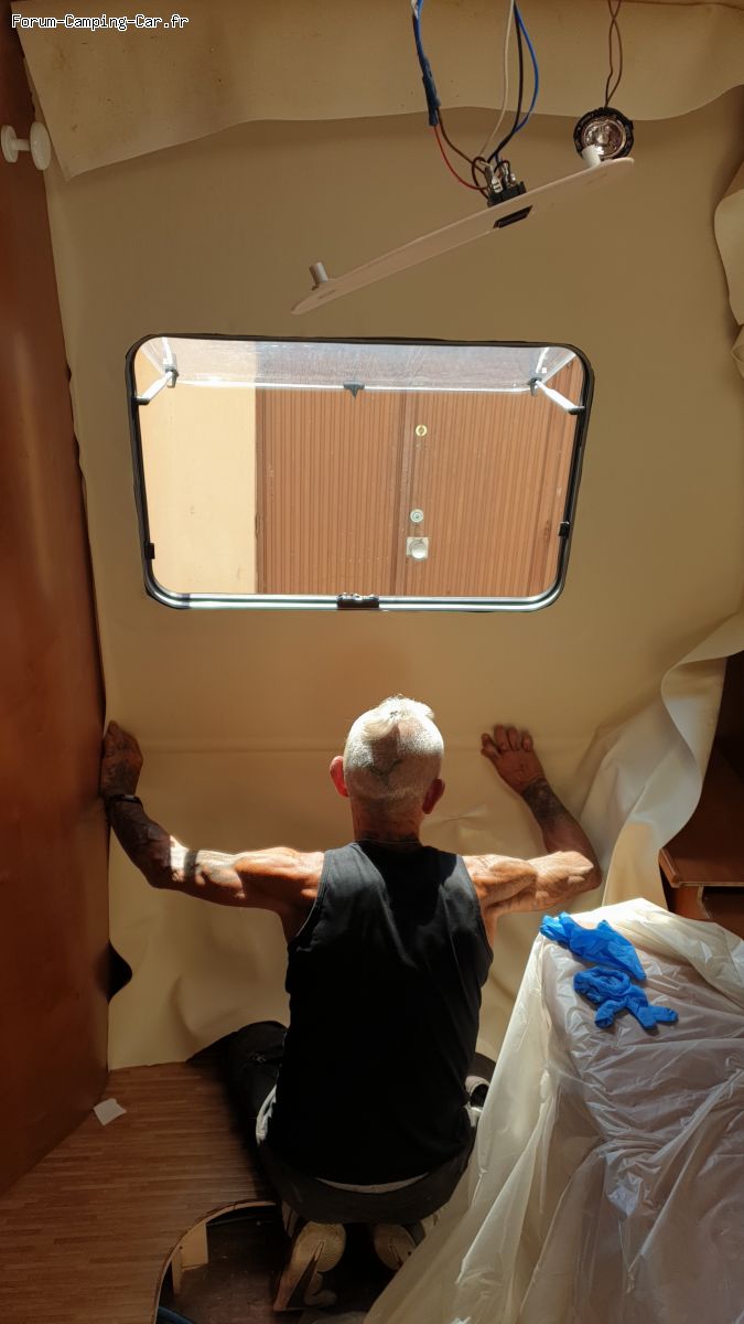 Pour les revetements interieurs, j'ai recouvert par un nouveau sky, en decoupant autour des meubles, comme conseillé par Charly, merci Charly. Degraissé puis appliqué une colle contact sur les 2 côtés, attendu 15 minutes puis collé. 2 jours de travail à 2 personnes.